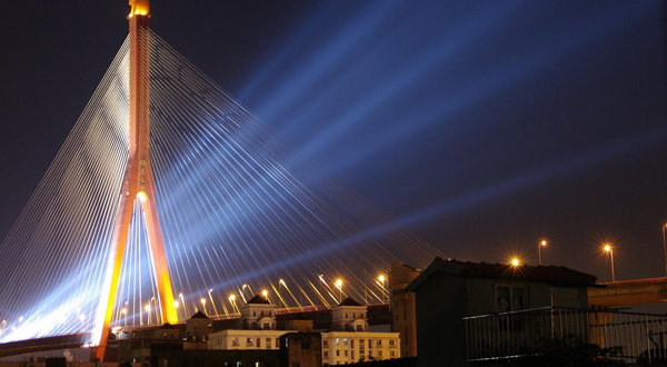 Under the light of the light, the Shanghai Yangpu Bridge is like a rainbow across the river, up to 208 meters of the tower column like a sword pierced the blue sky, numerous rows of neatly cable-stayed cable as if a huge harp wind The Full bridge design compact, sleek shape, constant light dozens of high power searchlight to create a magnificent sense of magnificent, like a rainbow across the river, is the famous landscape of Shanghai tourism.