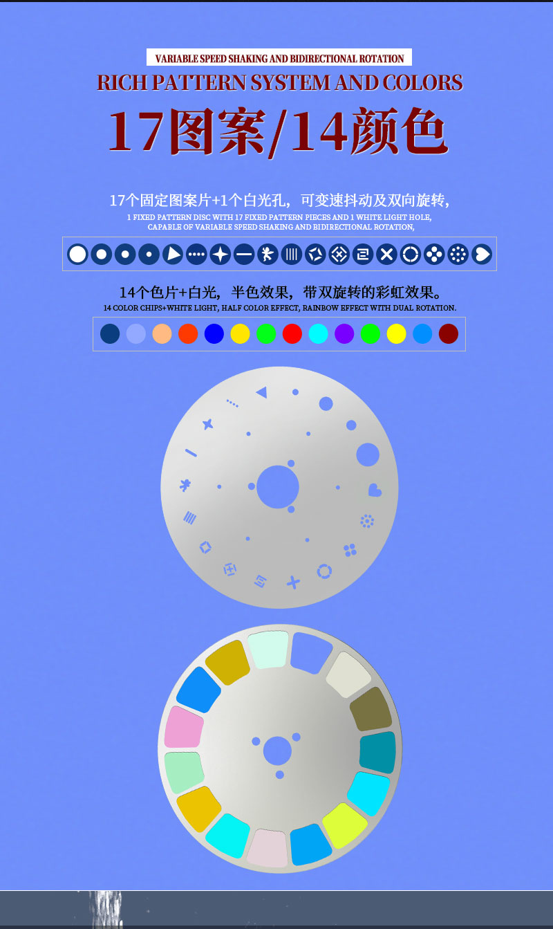 圖 案:13+白光 固定圖案盤可雙向旋轉速度可調支持圖案抖動;